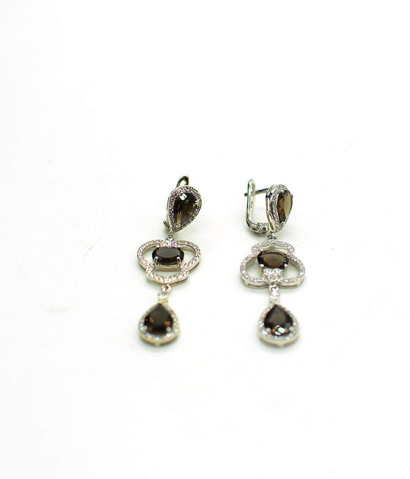 3 Stone Smokey Quartz Earrings. Silver.