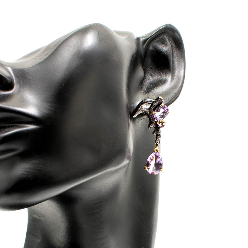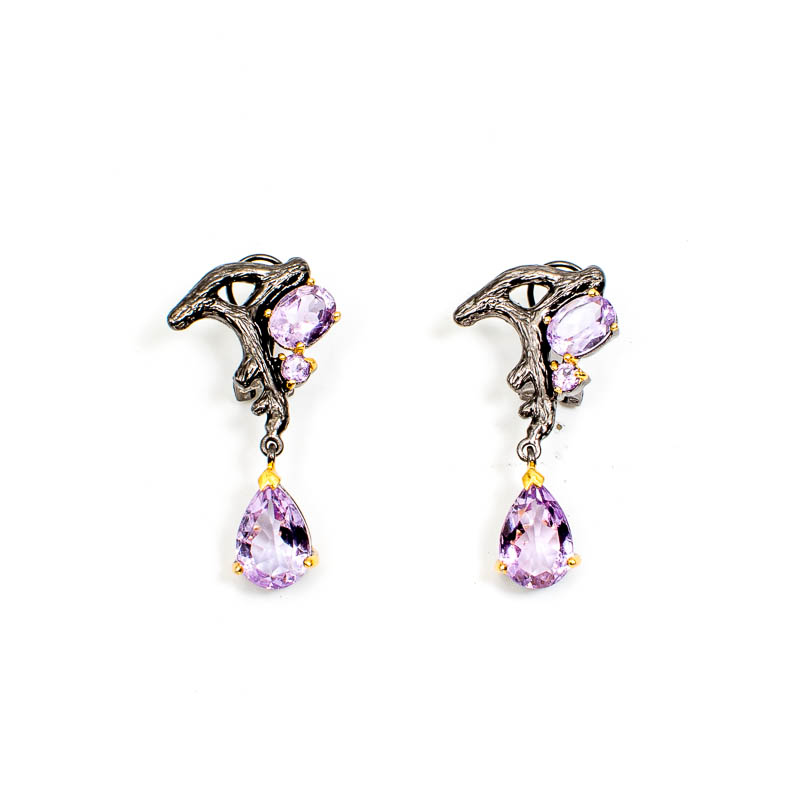 Amethyst Stones Set In a Twig-Design. Earrings. Blackened Silver.