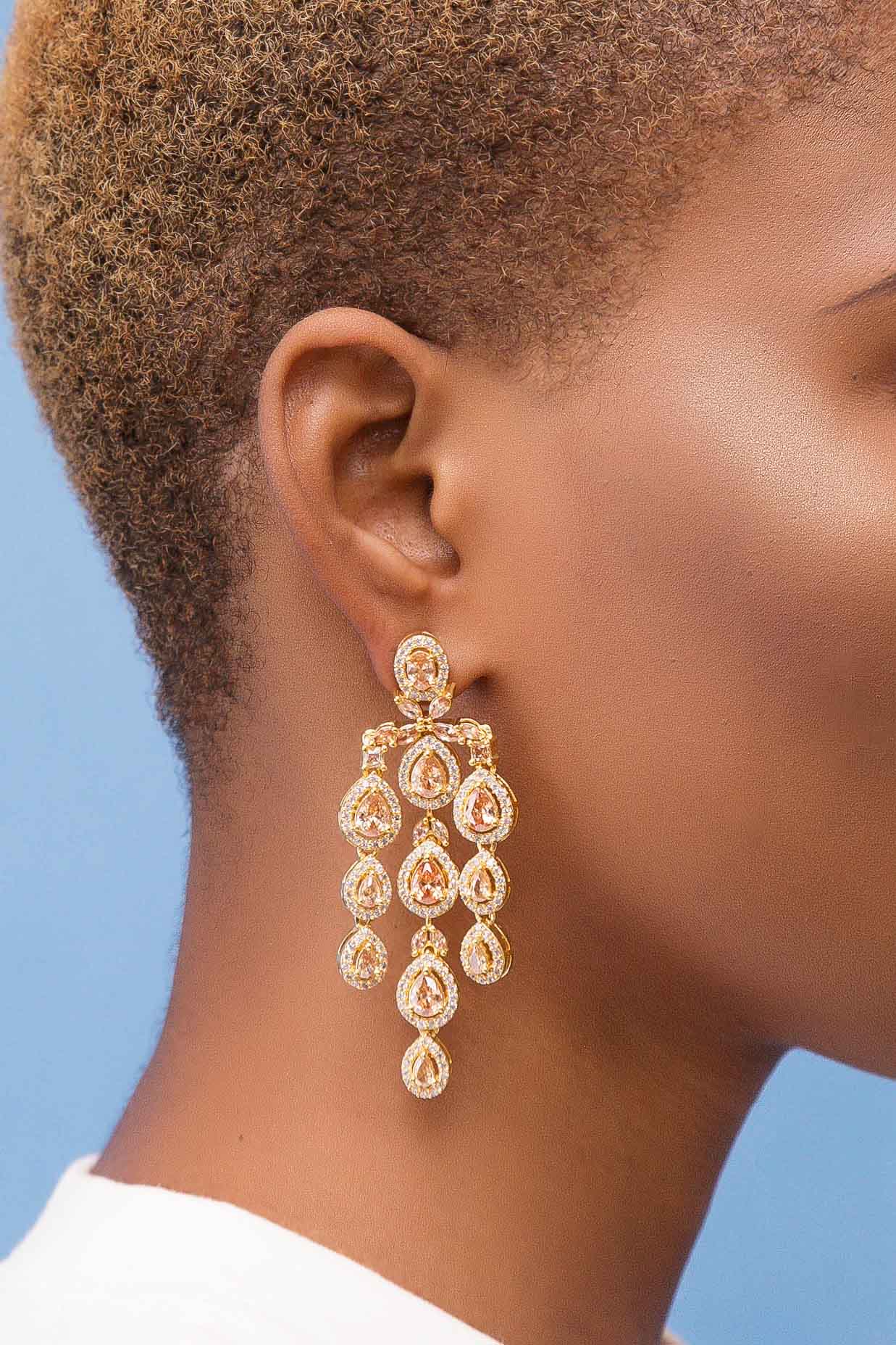 Chandelier Earrings. Clear And Citrine Coloured Cubic Zirconia. Gold Plated.