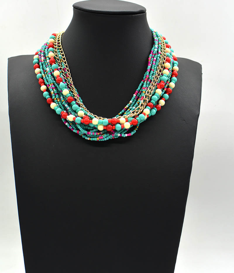 Colourful Turquoise, Red, Pink and White Multi Strand Necklace.