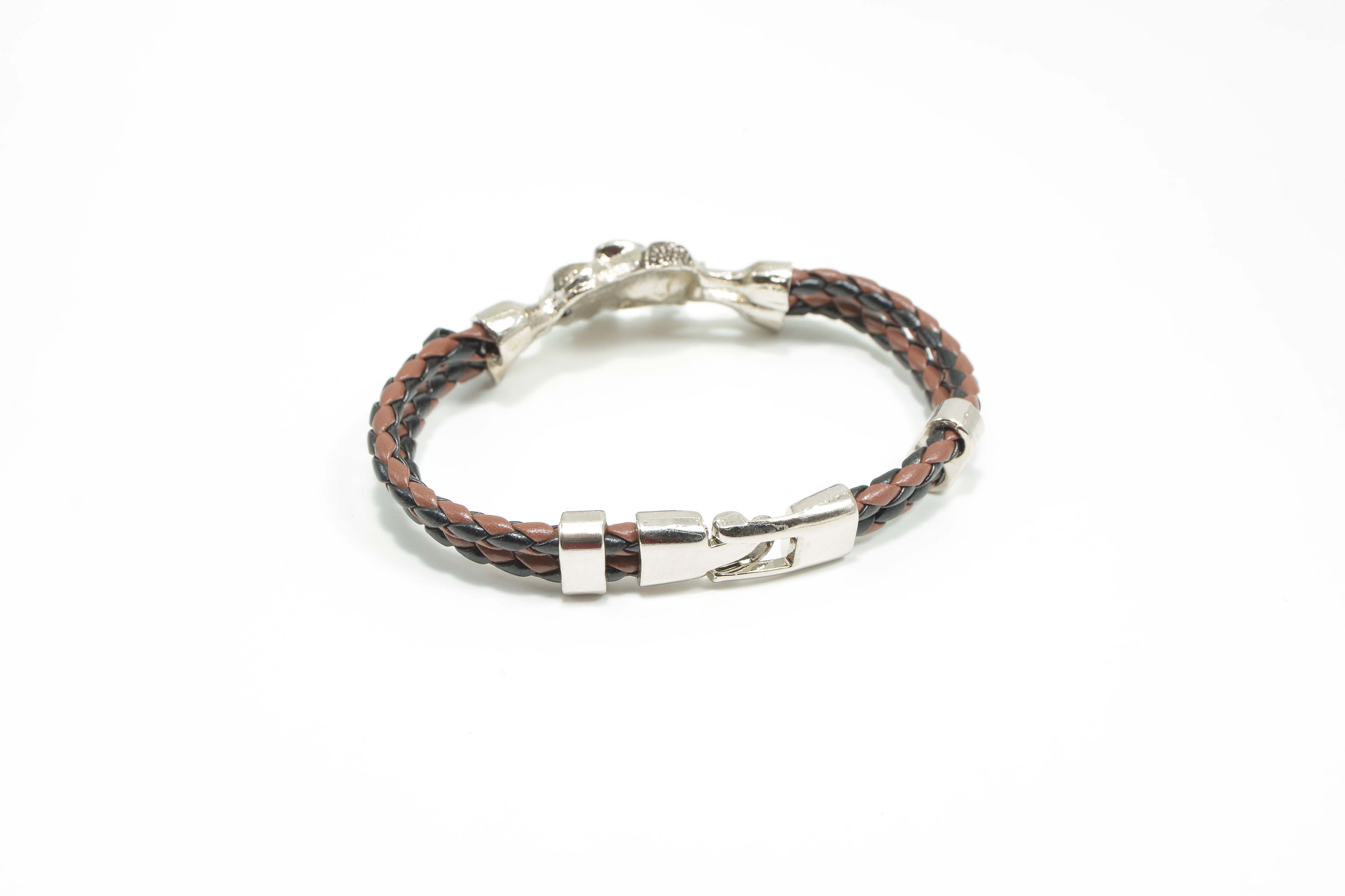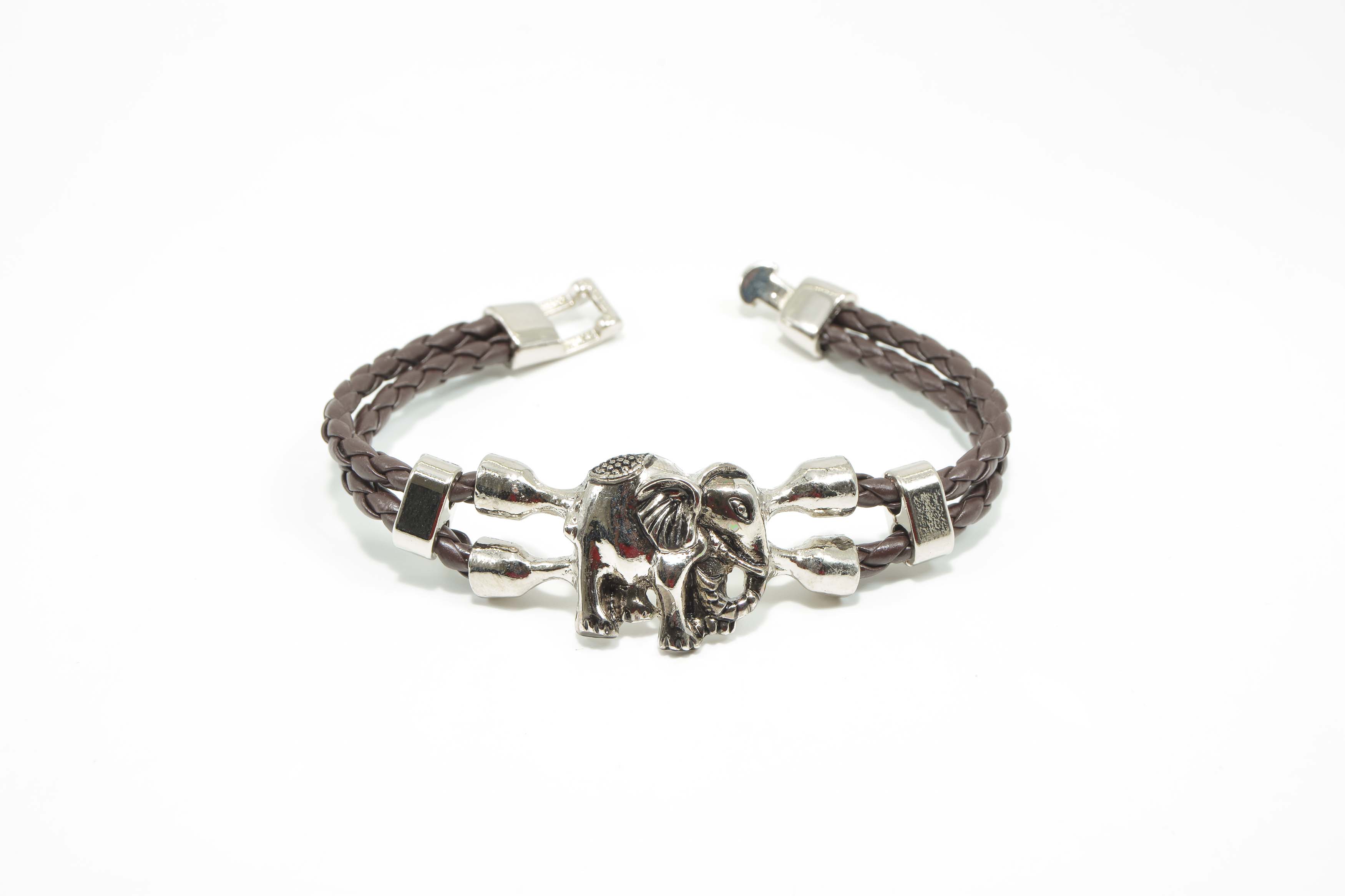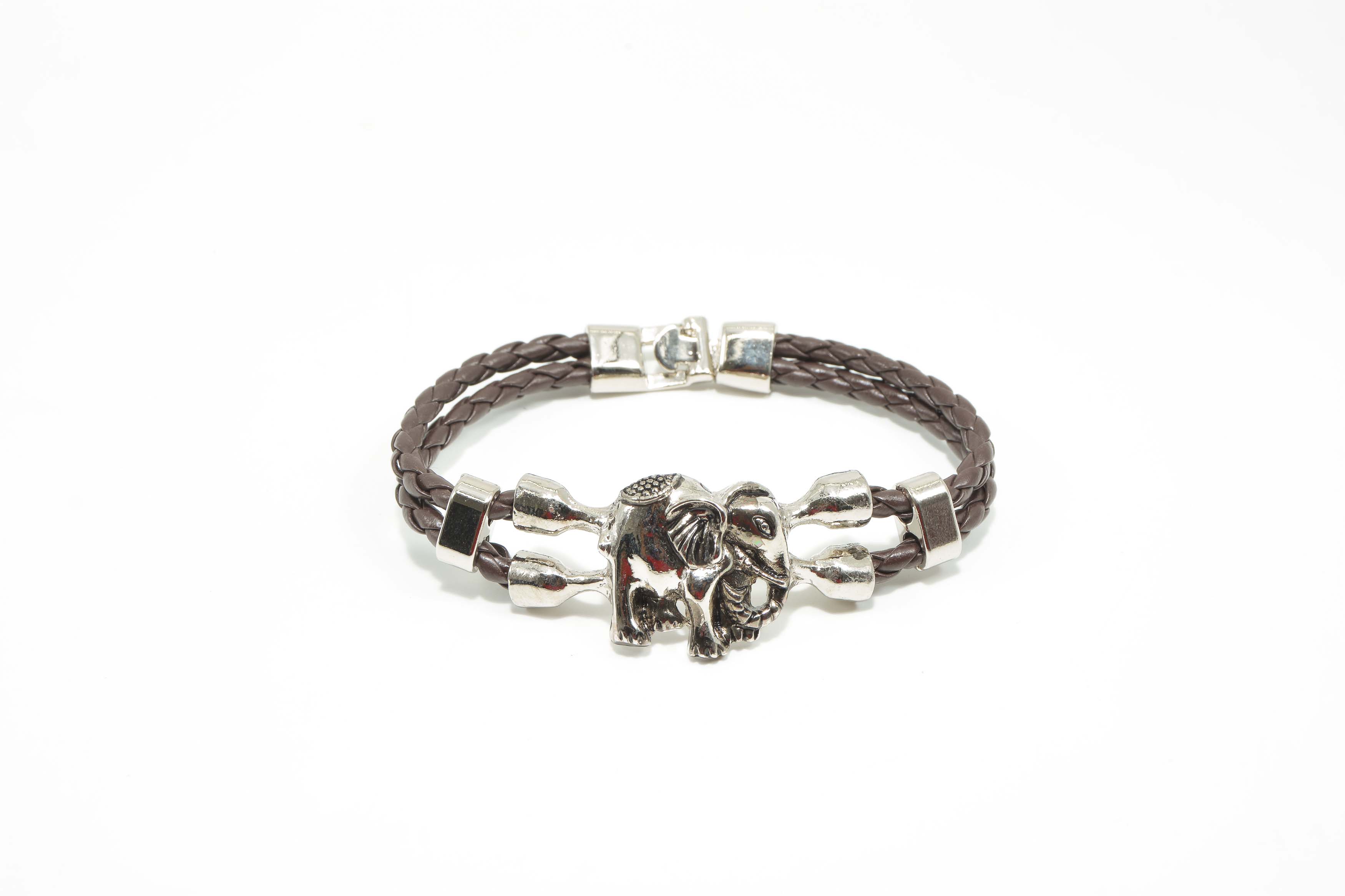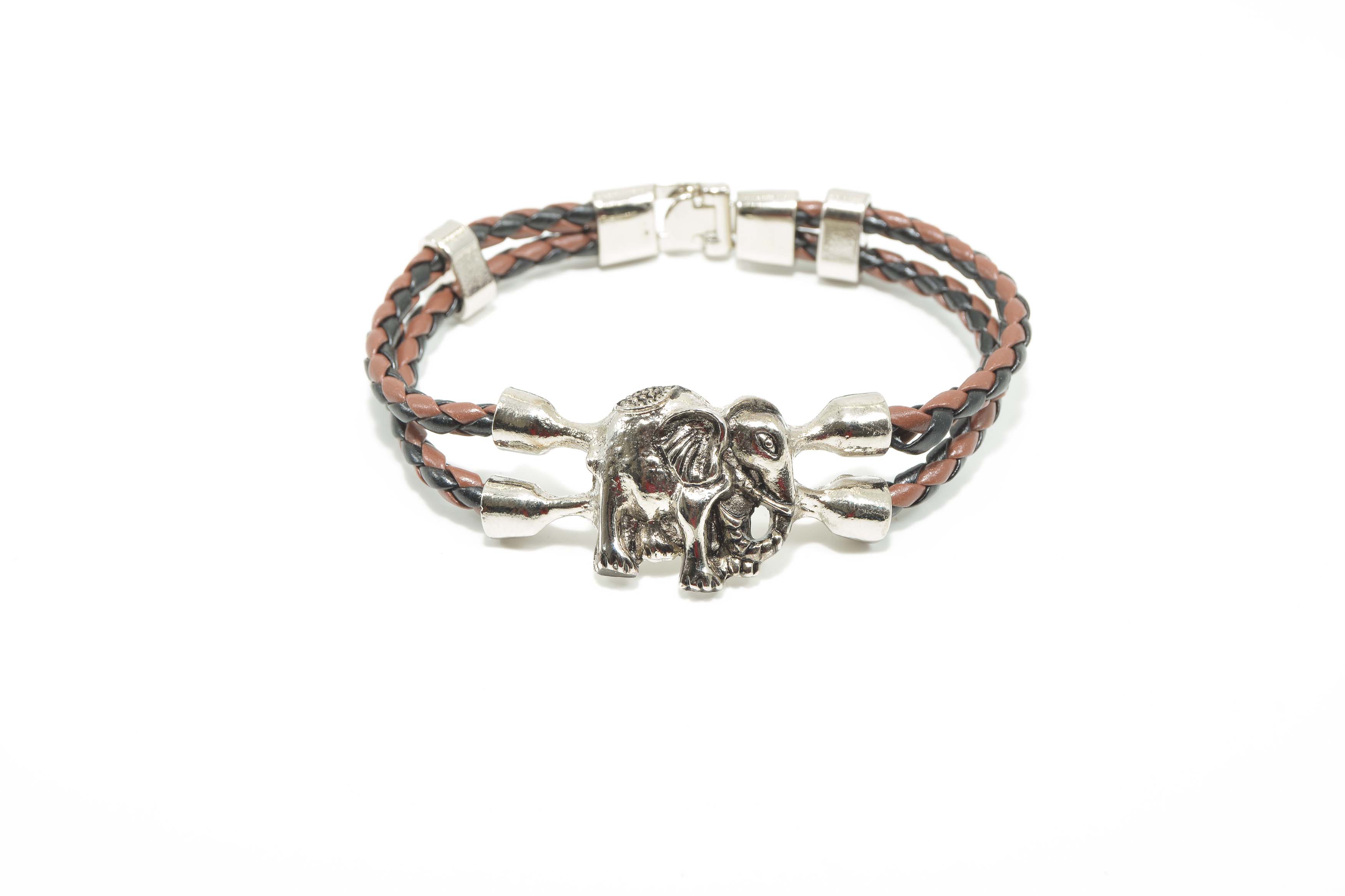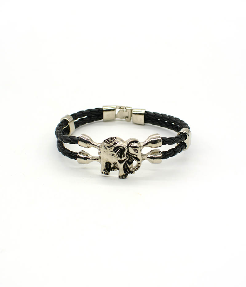 Elephant Design Steel Bracelet. Black Woven Faux Leather Straps.