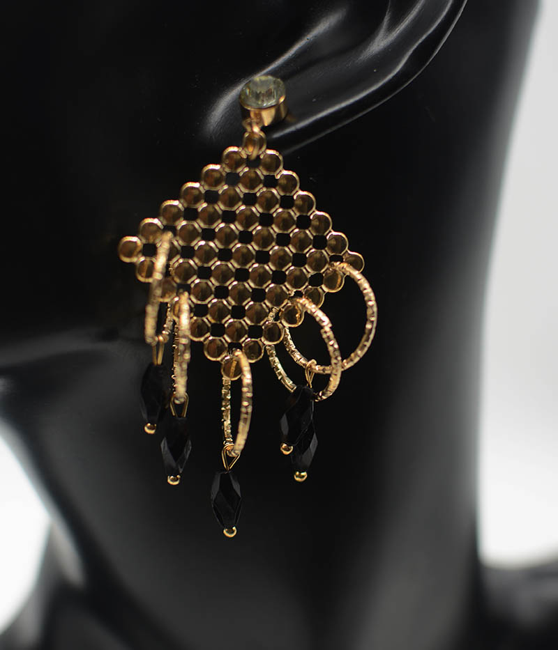 Gold plated Circles Dangling Earrings with Black Stones Detail.