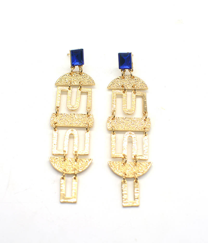 Long Rectangular Design. Gold Plated Earring with Navy Blue Stones.
