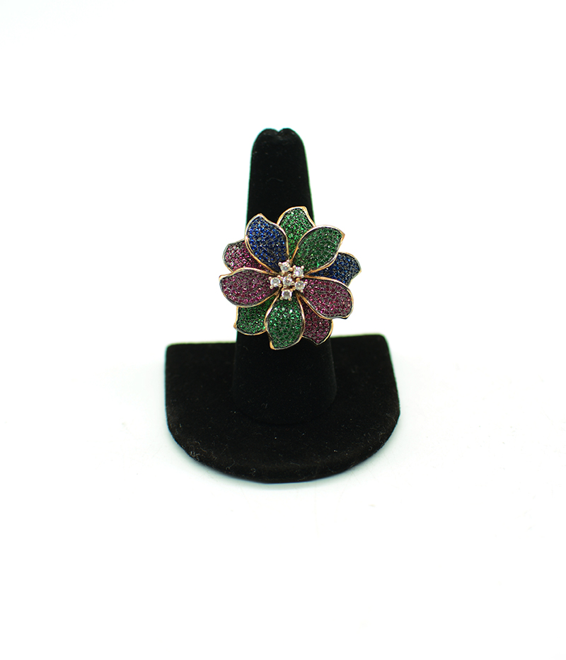 Multi Coloured Flower Cubic Zirconia Ring.  Rose Gold Plated. Silver.