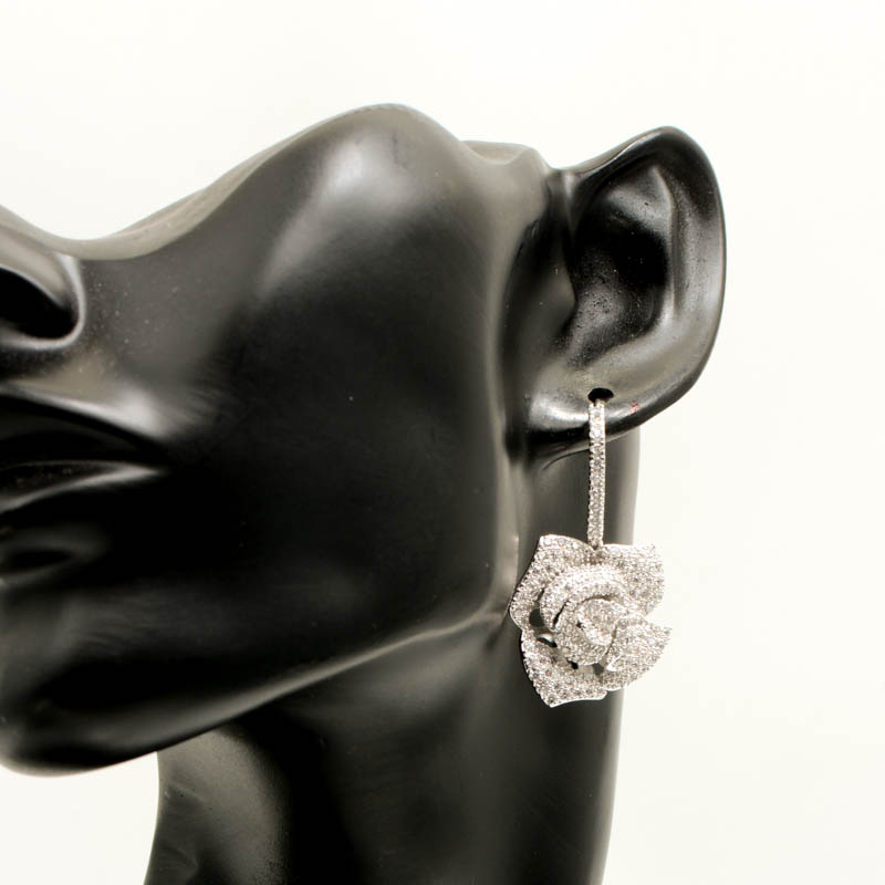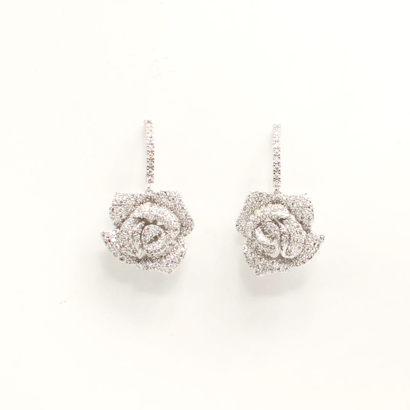 Short Drop Rose Cubic Zirconia Earrings. Silver Plated.