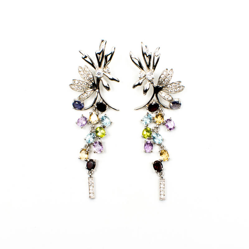 Trailing Flower Multi Gem Stone Earrings. Silver.